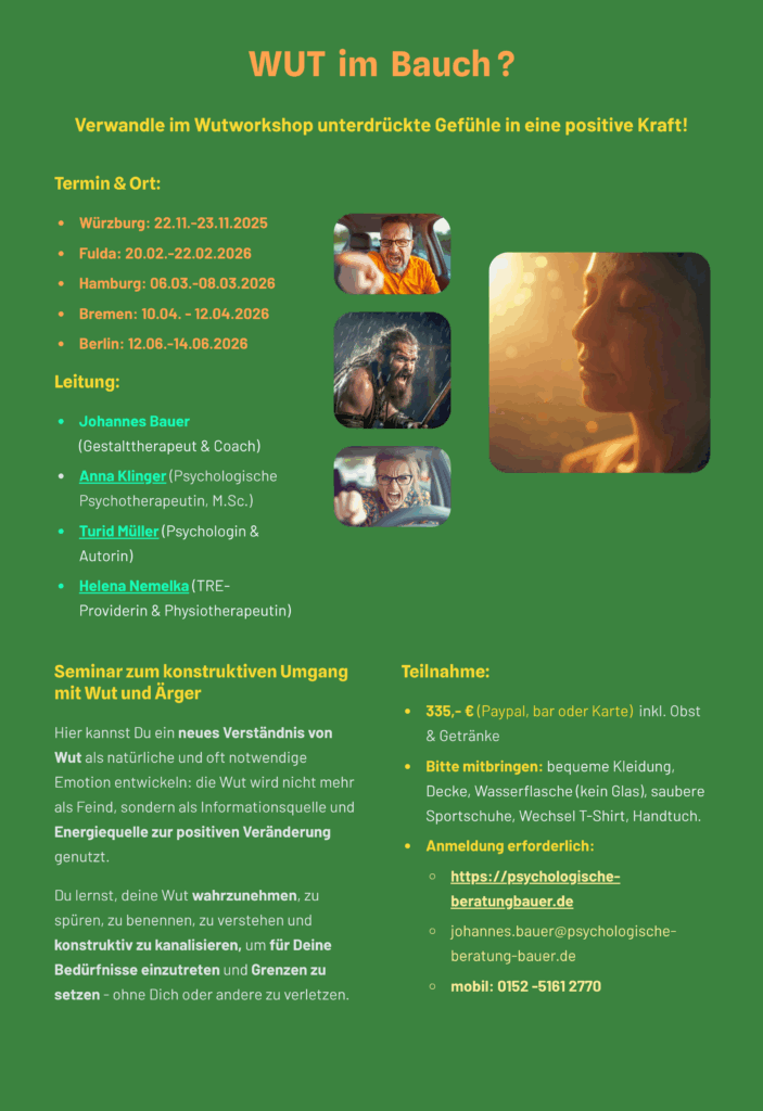 Hier kannst Du ein neues Verständnis von Wut als natürliche und oft notwendige Emotion entwickeln: die Wut wird nicht mehr als Feind, sondern als Informationsquelle und Energiequelle zur positiven Veränderung genutzt.